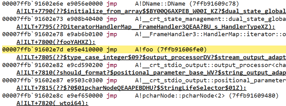 The addresses for calling foo and bar are emphasized here. The first call to foo is visible since it sets eax to 1 and returns again. To verify that the second highlighted address takes us to the bar thunk, we can dump the imports of main using dumpbin /imports main.exe: