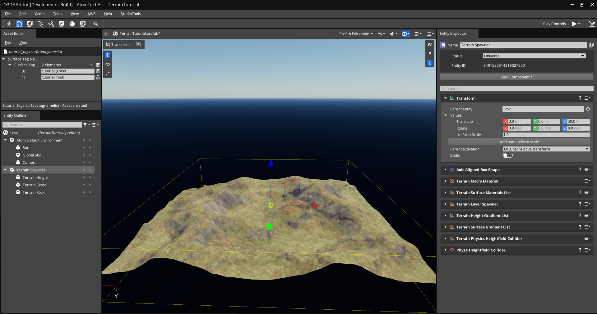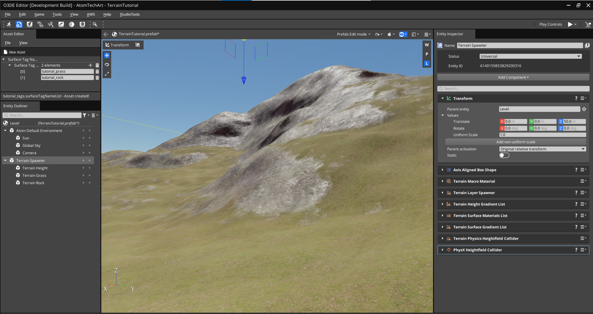 Terrain in Open 3D Engine (O3DE) is generated from gradients. Gradients, in the context of this tutorial, represent changes in elevation and weight masks for materials. Gradients can be generated procedurally or processed from an image. In this tutorial, you’ll create terrain elevation and apply detail materials using image gradients, and add support for PhysX simulations with a heightfield collider and physics materials.