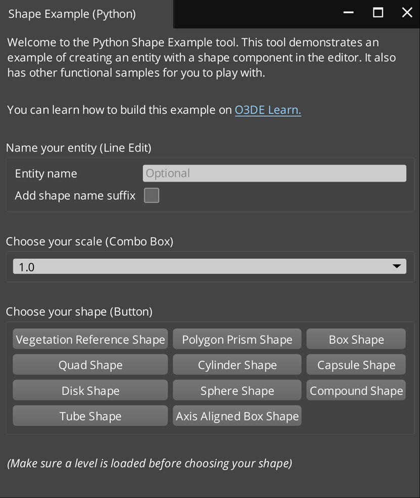 In this tutorial, you’ll learn how to extend the Open 3D Engine (O3DE) Editor using the PythonToolGem template to create a custom tool Gem called MyPyShapeExample. This custom tool allows you to create entities with a Shape component and configure their component properties. The Gem is written in Python with