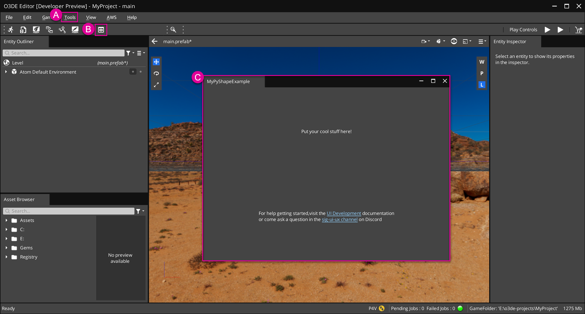 <repo>\sample-code-gems\py_gems\PyShapeExample.git clone https://github.com/o3de/sample-code-gems.gitBefore you can open the Shape Example tool, do the following: