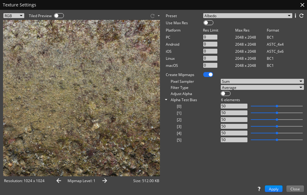 | Adjust Alpha | When enabled, the mipmap alpha channel can be manually adjusted at each mipmap level with Alpha Test Bias to ensure proper alpha coverage at each mipmap level. |