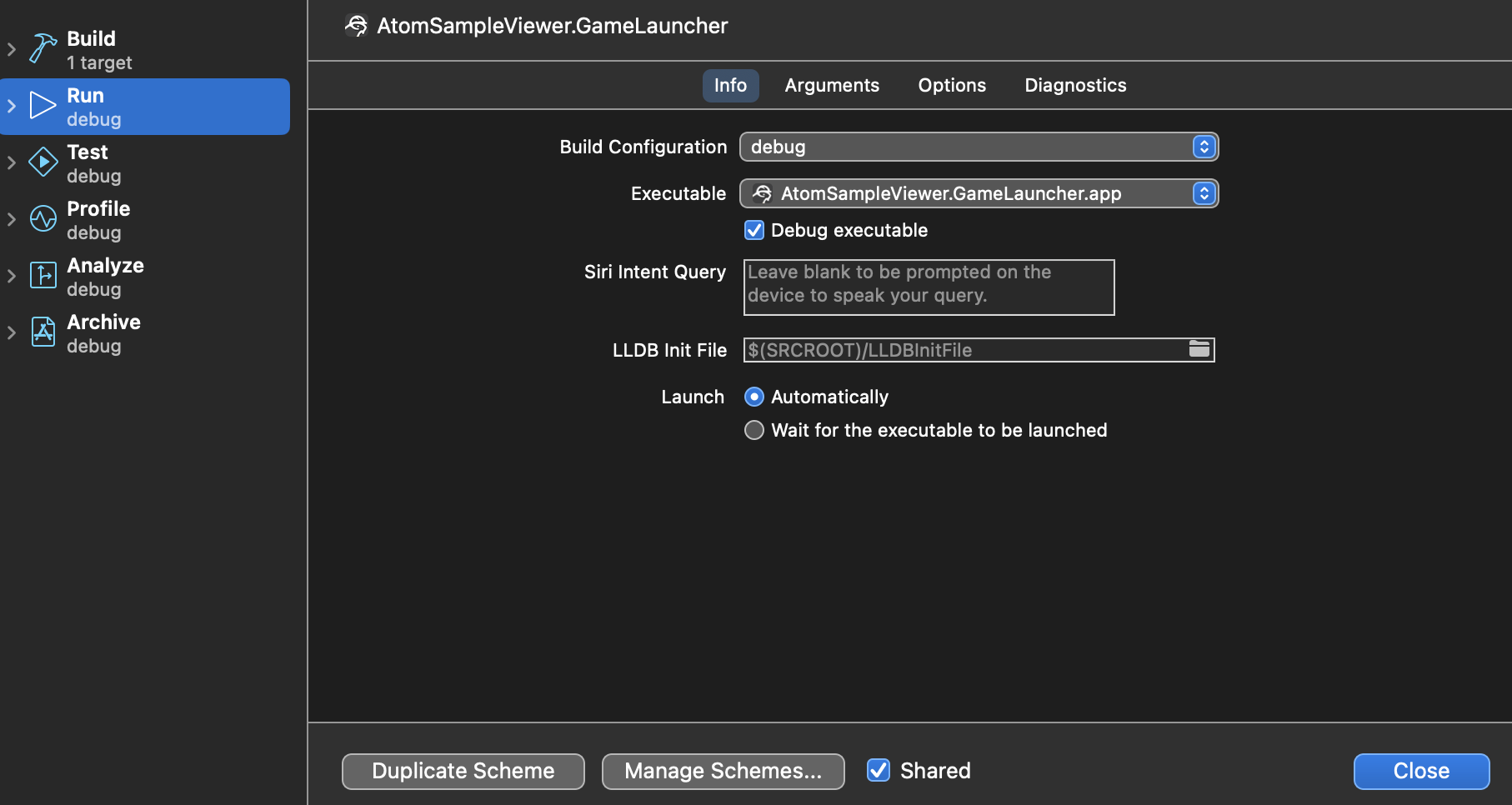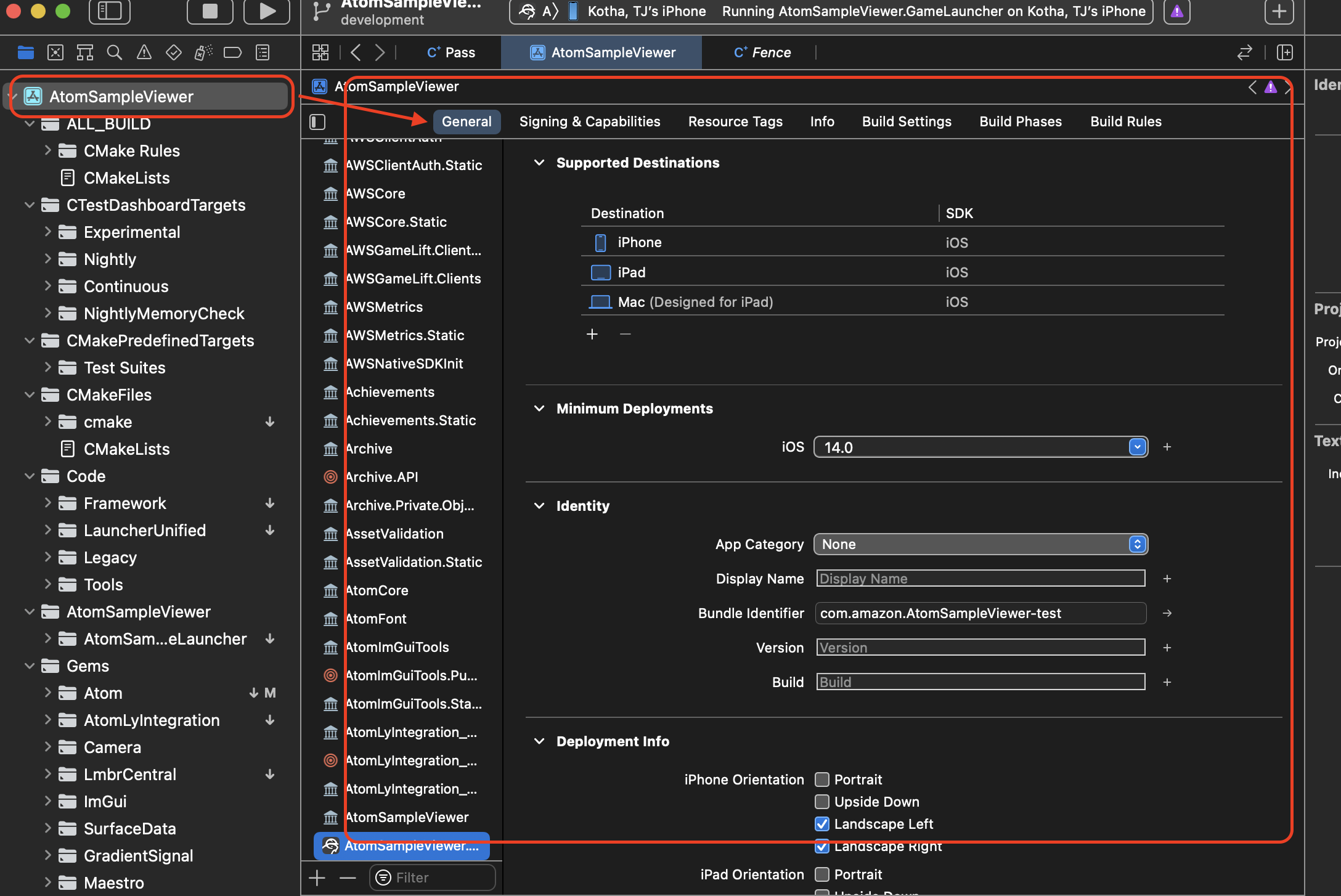 Next, we’ll open the project configuration details. Click on the AtomSampleViewer project icon in the Explorer tree-view (left hand side of the Xcode IDE). On the left column under “General”, select the build configuration AtomSampleViewer.GameLauncher. The resulting configuration page should look like this: