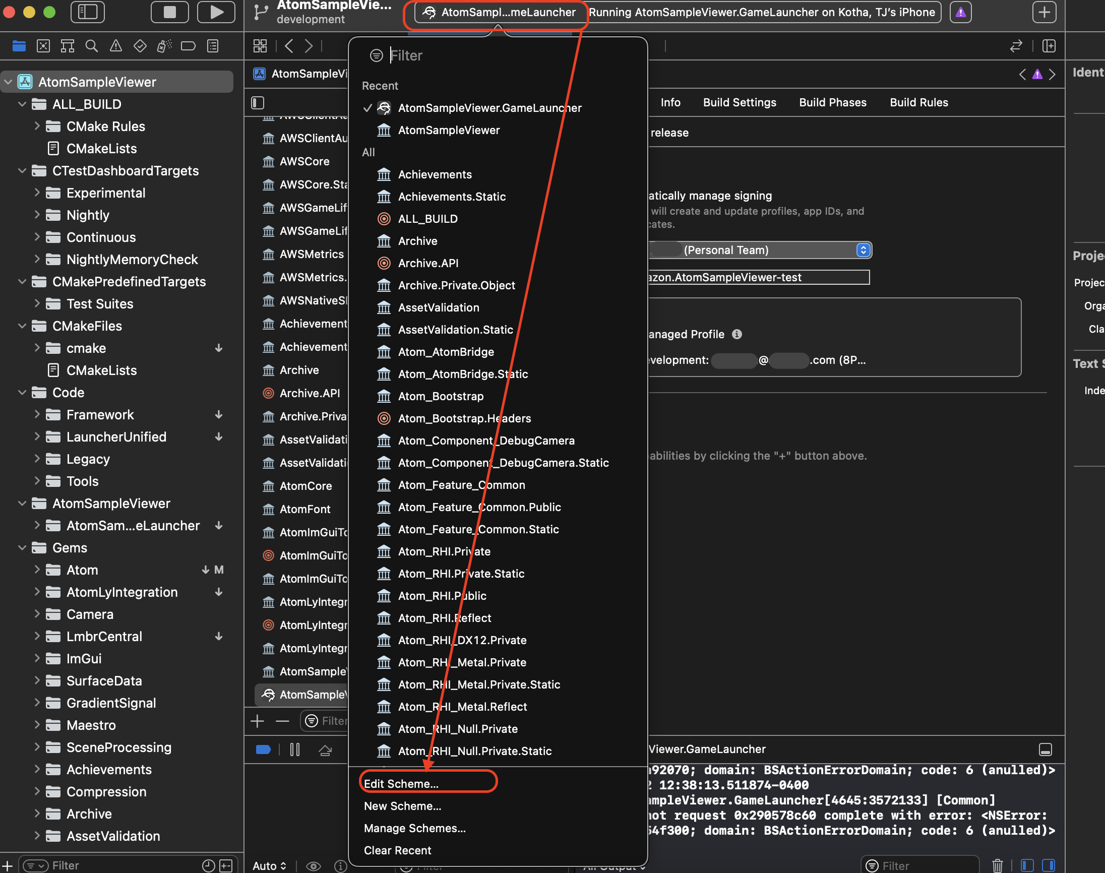 Click on the bar in the region labeled “AtomSampleViewer.GameLauncher” and scroll through the drop down to click “Edit Scheme.”