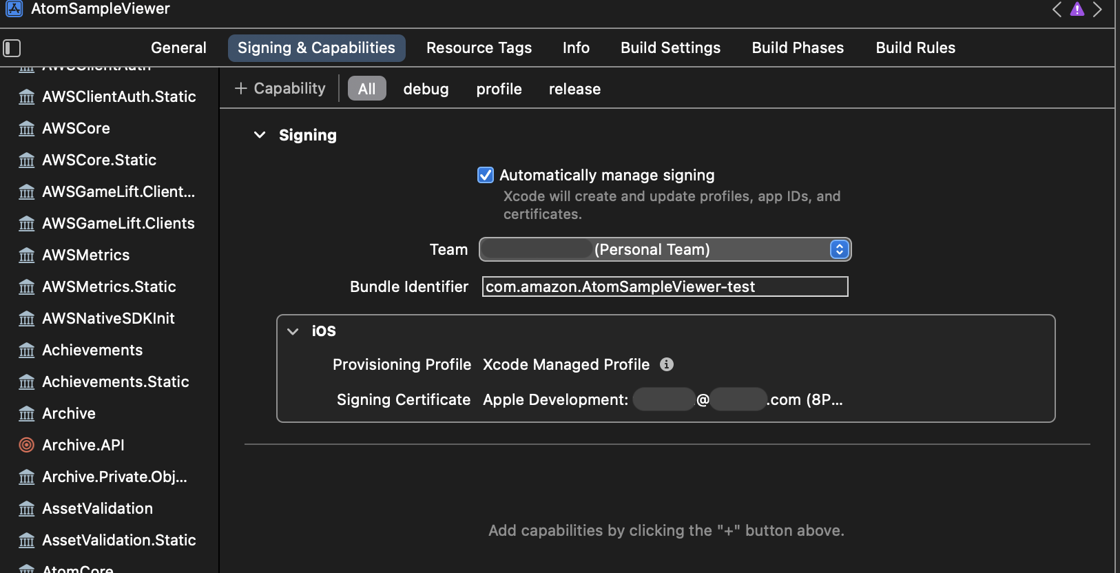 Go to the “signing and capabilities” tab and setup the provisioning profile to link to your Apple ID. Customize the bundle identifier (add any string you want, for example: append the phrase ’test’). Enable “Automatically manage signing.”