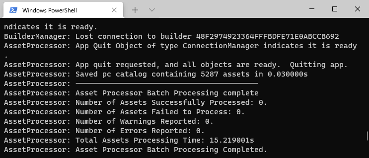 First, this command builds the Asset Processor tools. Then, it runs Asset Processor Batch and processes the assets. You don’t need to rerun Asset Processor or Asset Processor Batch unless you make changes in your project.