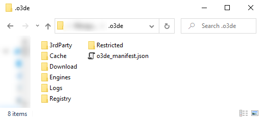 The .o3de directory is located in the user’s home directory. It contains O3DE configuration settings and Project Manager logs, the default location for third-party downloadable packages, and other user-specific directories: